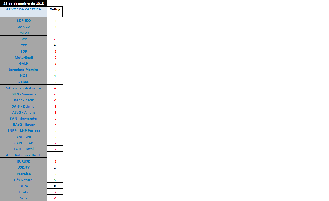 Os ratings podem variar em qualquer papel de -8 a +8. As posiçoes sugeridas, essencialmente de caráter tendencial mas com uma pequena contribuiçao de cerca de 33% da componente oscilatória, apontam para, sempre que possível, tomar no caso da minha carteira pessoal os seguintes sinais: