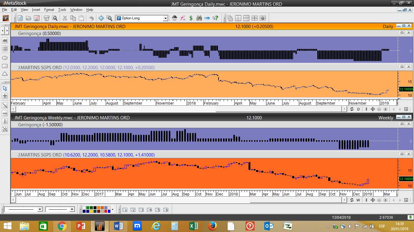 Junto também um gráfico da Jerónimo Martins, onde a cautela ainda impera: a performance positiva no gráfico diário ainda é insuficiente para compensar a pendente negativa no semanal, segundo o sistema de trading.