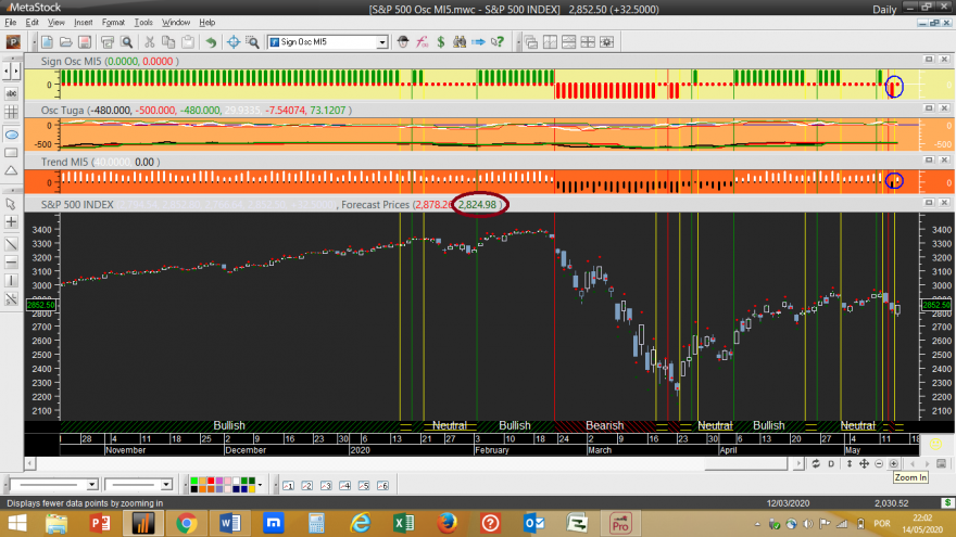 Vamos supor que no final do dia o sistema “Osc MI5” dispara um sinal de compra numa acção X, que se encontrava neutral, devido à passagem duma tendência diária de negativa para positiva.