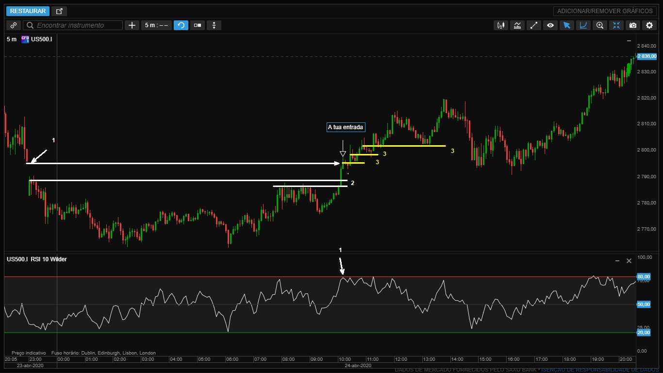 1. A entrada dada pelo sistema se tem em conta apenas o RSI, então este é um bom exemplo de como o RSI não é o melhor dos osciladores quando usado sem algum cuidado (conselho sobretudo para os mais novos);