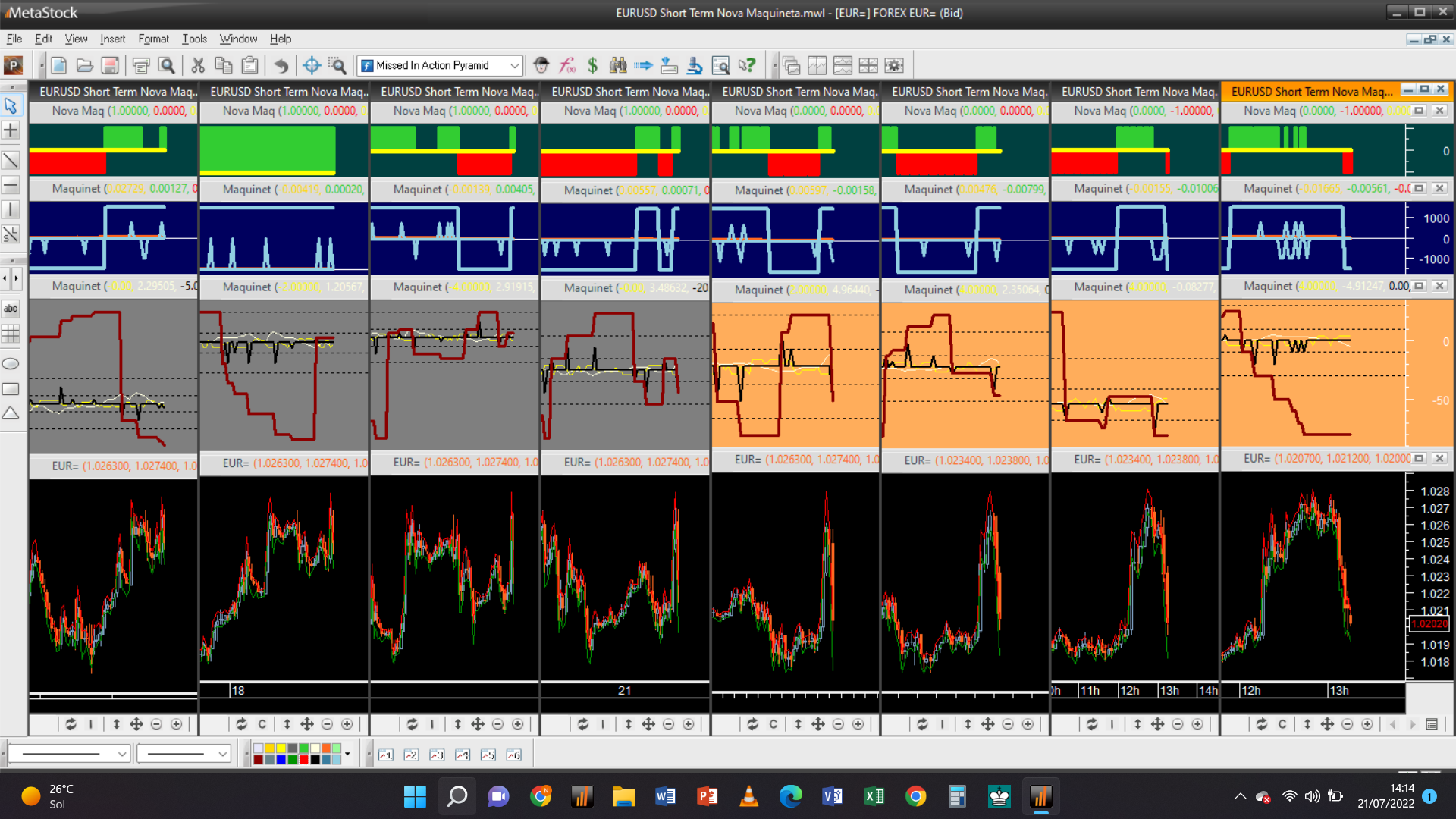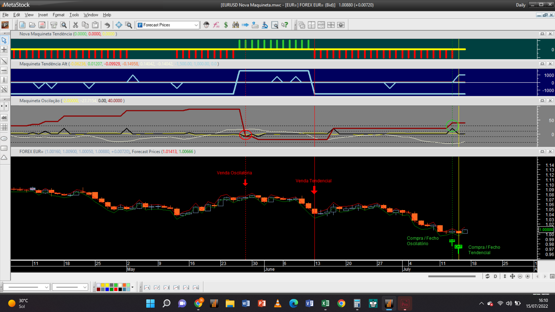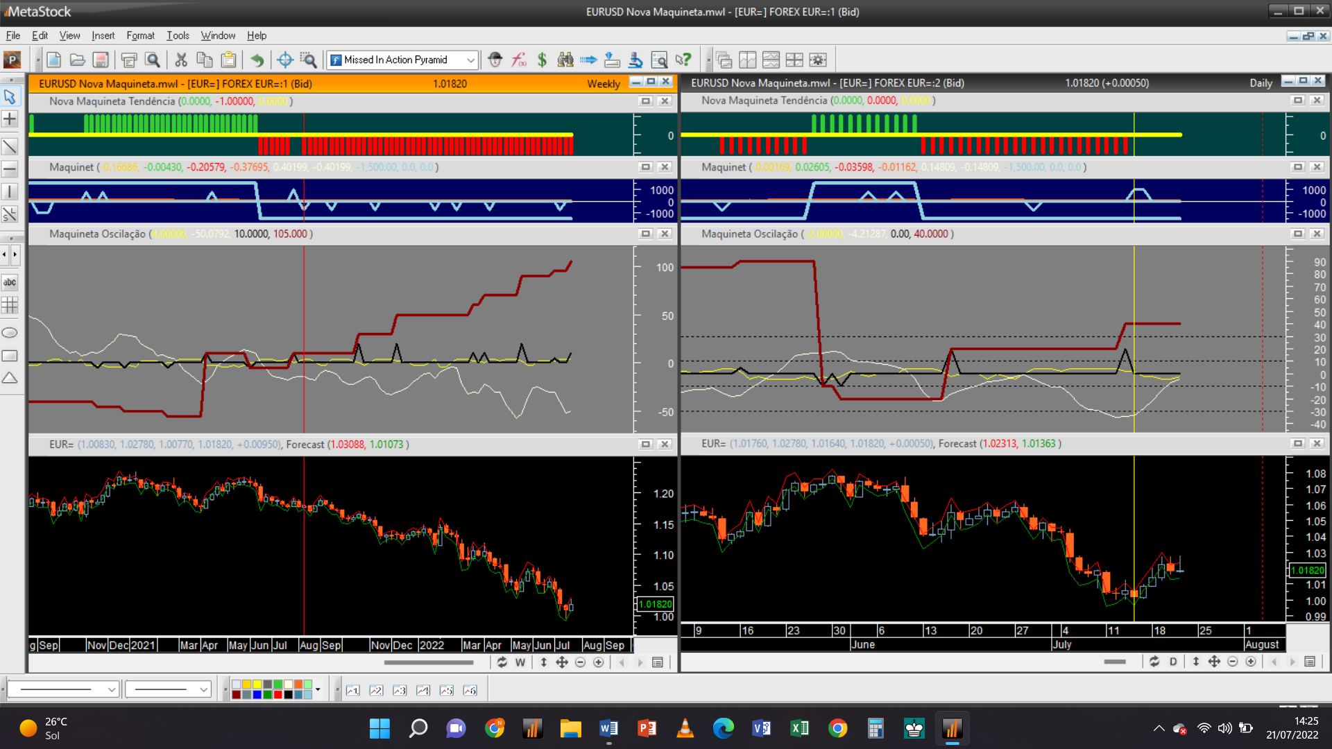 Às 14h 15m, pouco tempo após a decisão do BCE em sibir a sua taxa diretora em 0.5%, o panorama do EuroDollar nas escalas de curto prazo era a que apresenta abaixo o layout do sistema de trading que utilizo: