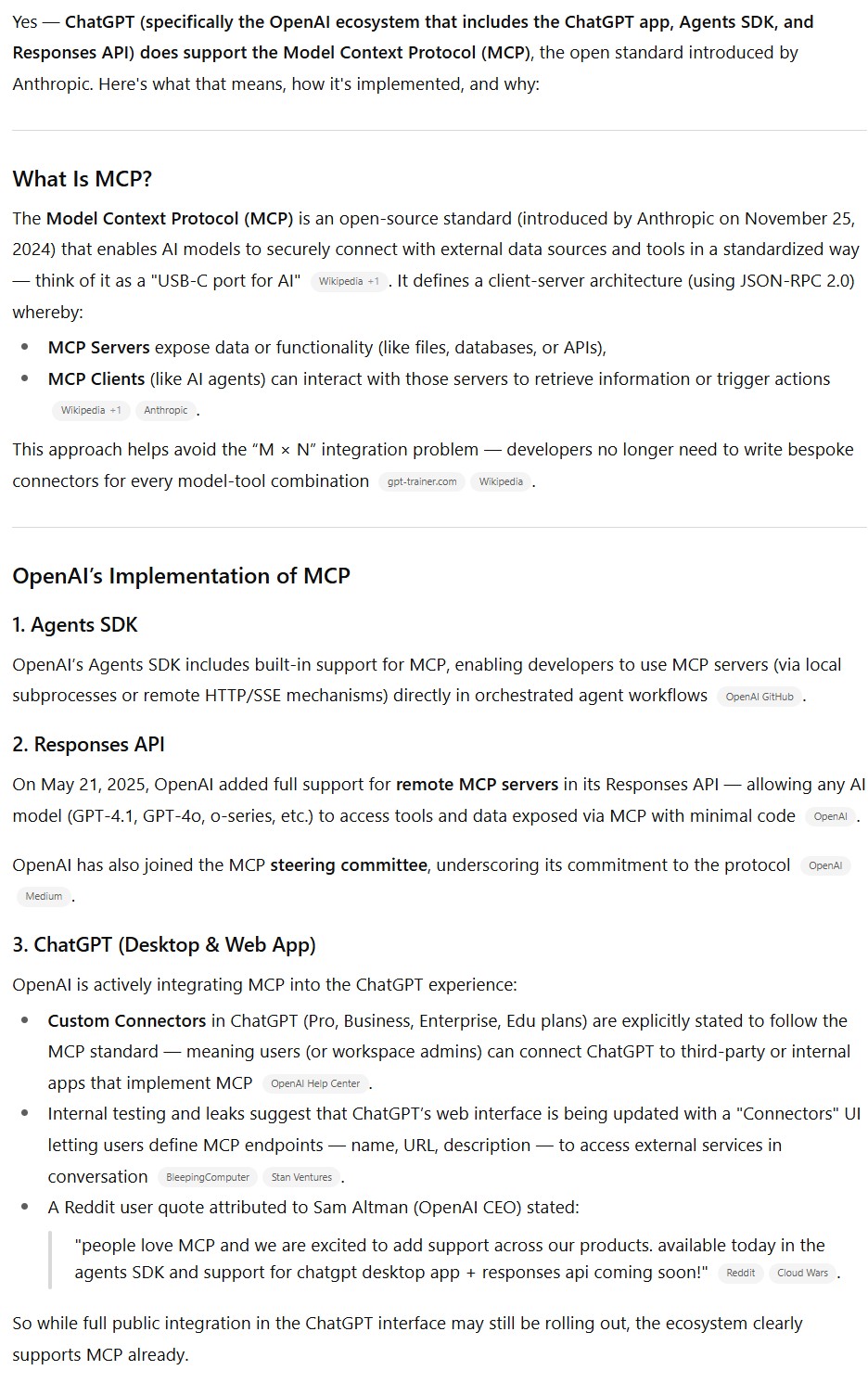 - O Model Context Protocol é usado (tal como referi) da melhor maneira possível (à data) pelo ecosistema da Open AI, nomeadamente: