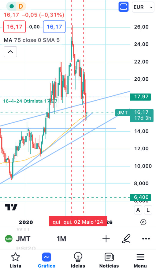 No gráfico mensal da JMT parece que há indicadores de momentum que caíram muito menos que o preço. Isso pode ser uma divergência positiva e indicar uma possível inversão próxima ou então descer com menos intensidade. Acho que se pode ver nos próximos dias ou semanas se o preço consegue ir para cima do valor que referi da média móvel e manter-se acima ou se não consegue. Neste momento está em baixo. Não sei o que vai acontecer.