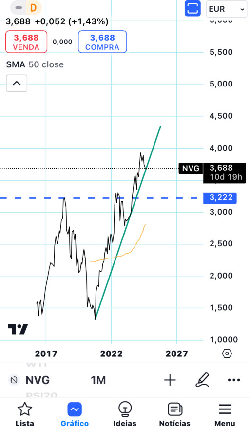 No gráfico da NVG também se nota bem a diferença. Sem o gráfico ajustado, o máximo mensal de fecho está próximo de 5,34.