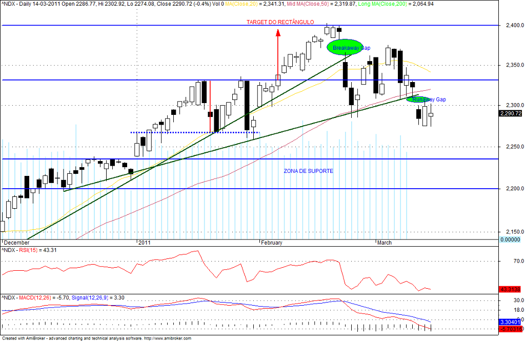 No dia 10 de Março (precisamente na véspera do terramoto), alertei neste tópico para a quebra da MMS50 e referi a possibilidade de se estar a desenhar uma cabeça-e-ombros no Nasdaq 100. Isto sugeria que os vendedores já estavam a tomar o controlo do mercado.