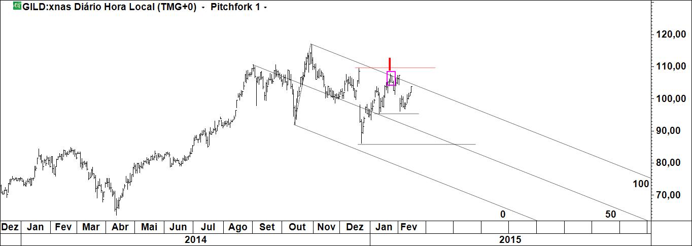 a entrada compradora foi na ML, a 51 e picos. Os sucessivos gráficos que fui pondo apontavam para essa zona e foi nela que coloquei a ordem compradora. O raciocínio que fiz com a has havia feito com a amat. Ao fim e ao cabo, comprei um higher low numa tendência ascendente. O mesmo raciocínio, mas agora na sua versão inversa, foi feito na gild (vendi um lower high num contexto descendente).