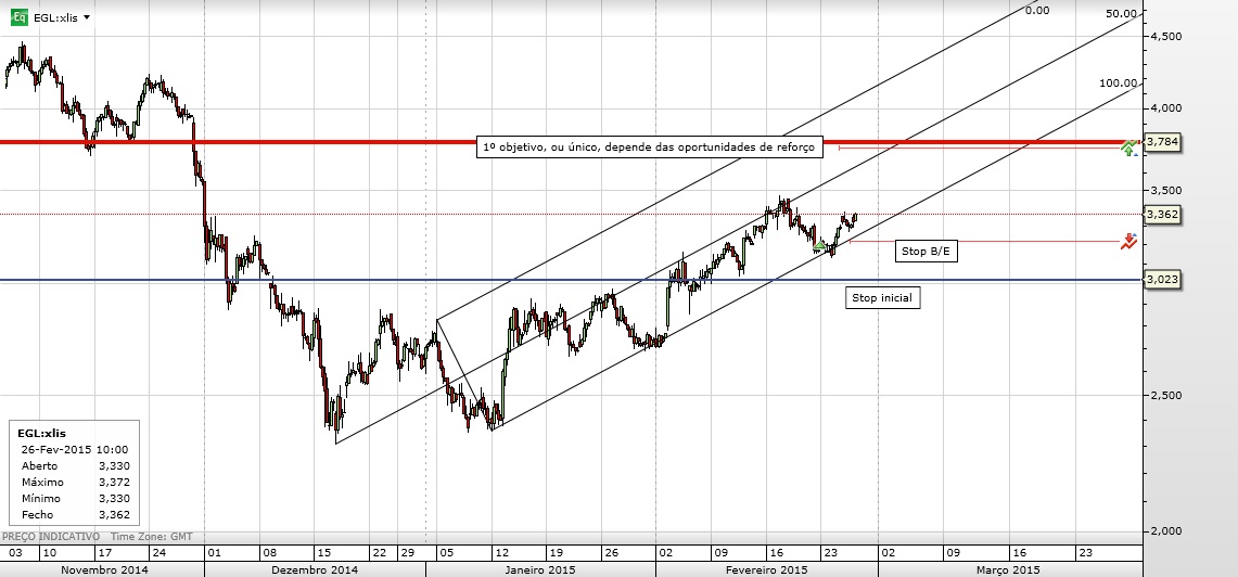 No segundo caso escolhi a EGL, nunca tinha entrado longo na EGL. Neste caso só olhei para a forquilha. O negócio continua aberto, mas já sem risco e a valorizar 4%, mais ou menos.