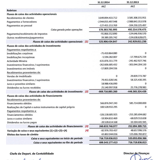 para fechar o dossier sonangol a d fluxos caixa, a empresa é terrivel a gerar cash, se gera prejuizo com o custeio do outsorcing como será em 2015, como será o cash flow.... em 2014 139000m azk de lucro e cash flow negativo em 400000m azk ou 3000m de euros, investimentos gigantescos na atividade mineira que não valem nada recebimentos do estado angolano para ir ao bes e ao bcp( o que prova o ridiculo de mesmo com a sonangol toda queimada irem ao AC do bcp tudo pelo poder, como no caso do bpi...), chocantes mais de 2000m saidos de caixa em investimentos financeiros e suprimentos