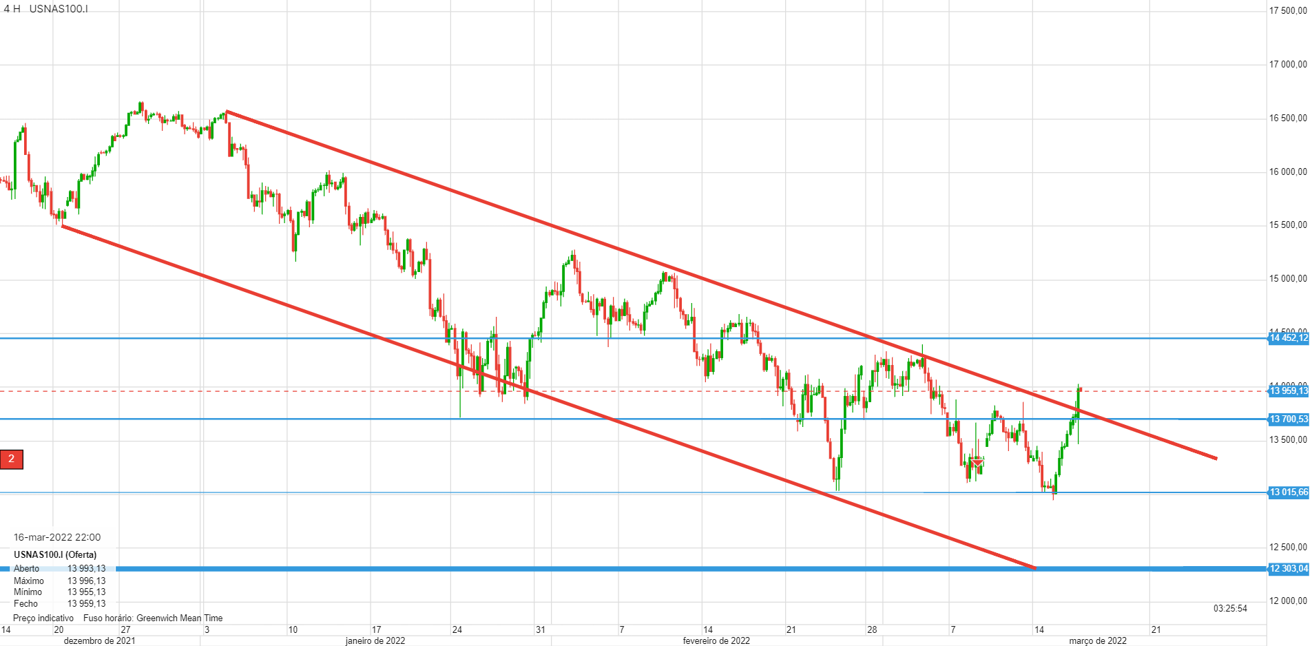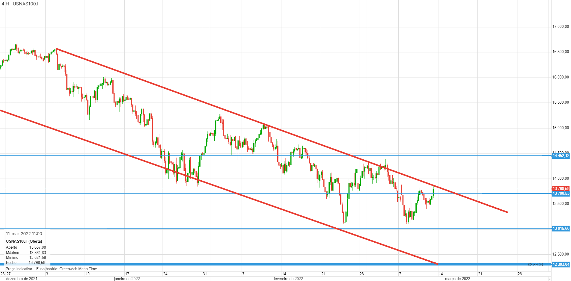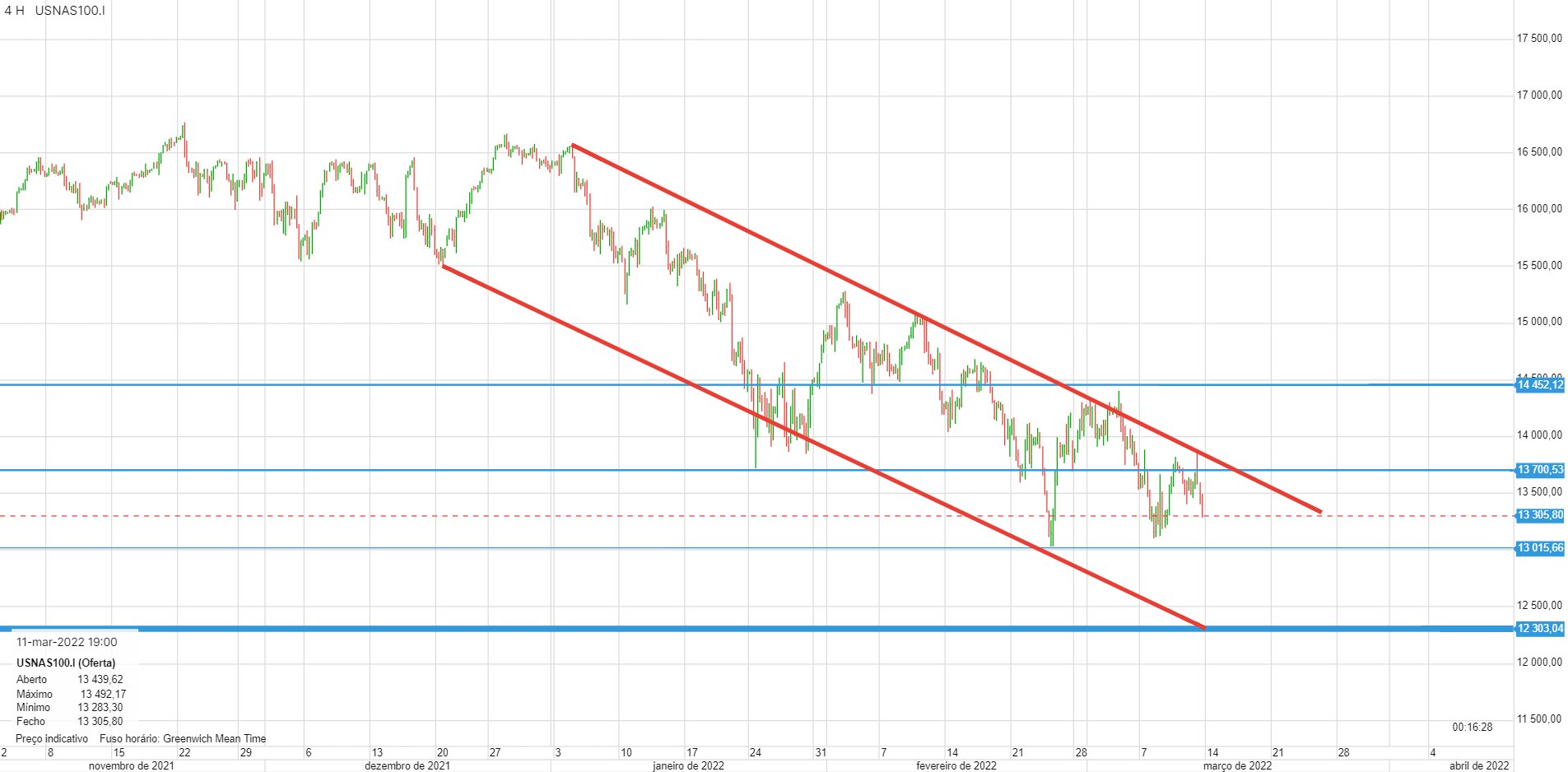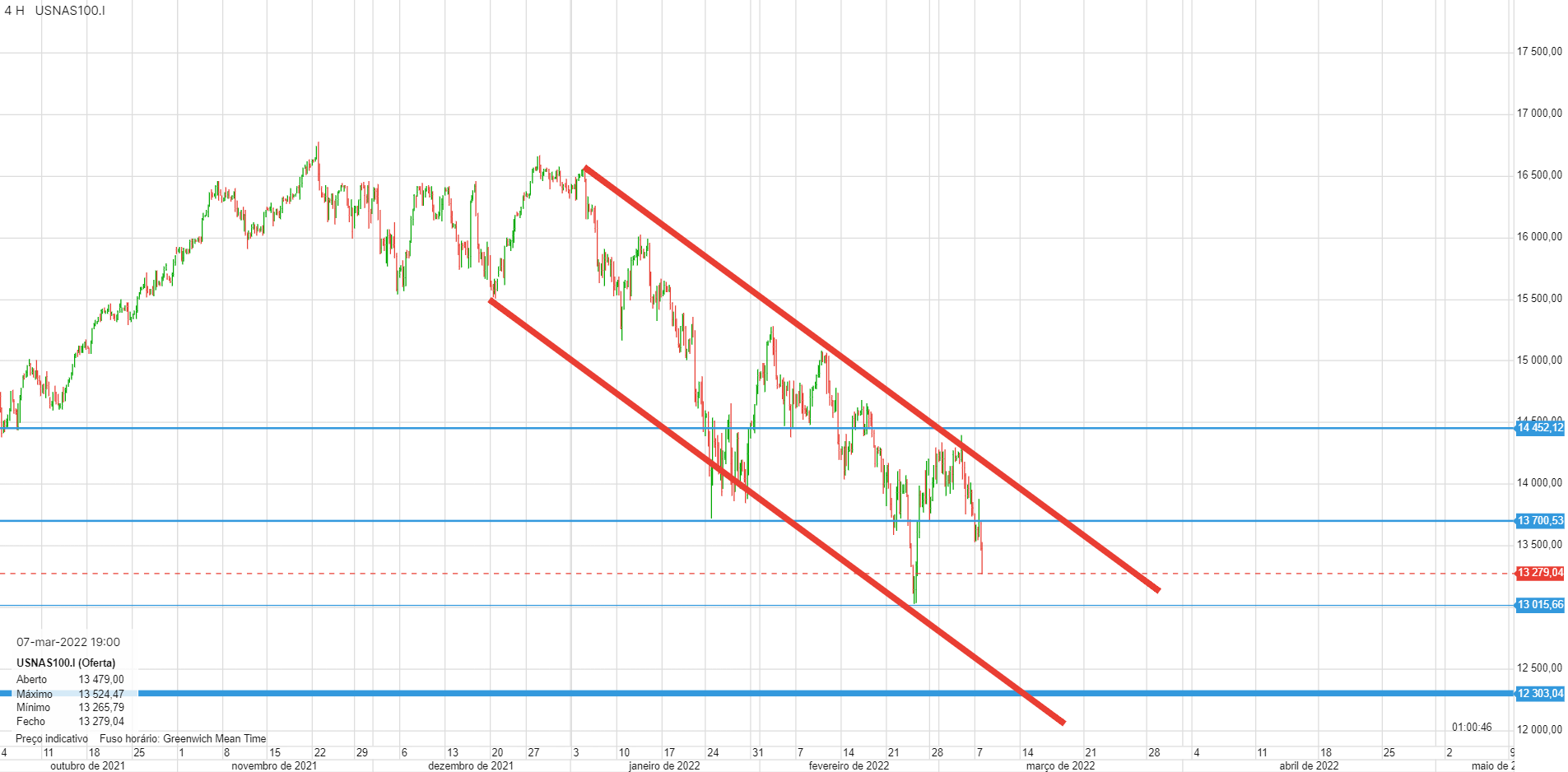 Este canal no gráfico de 4 horas tem-se revelado bastante certeiro. A caminho dos 13000 e provavelmente dos 12300.