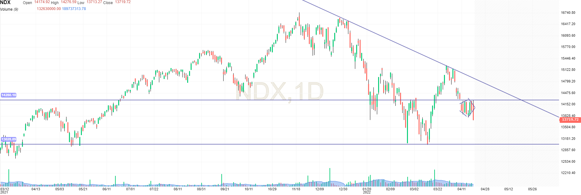 O canal descendente no gráfico de 4 horas continua em boa forma. Hoje tocou nos 13000 (13016) e poderá reagir a estes valores. enquanto não quebrar este canal em alta, apenas entradas curtas são aconselháveis (the trend is your friend)