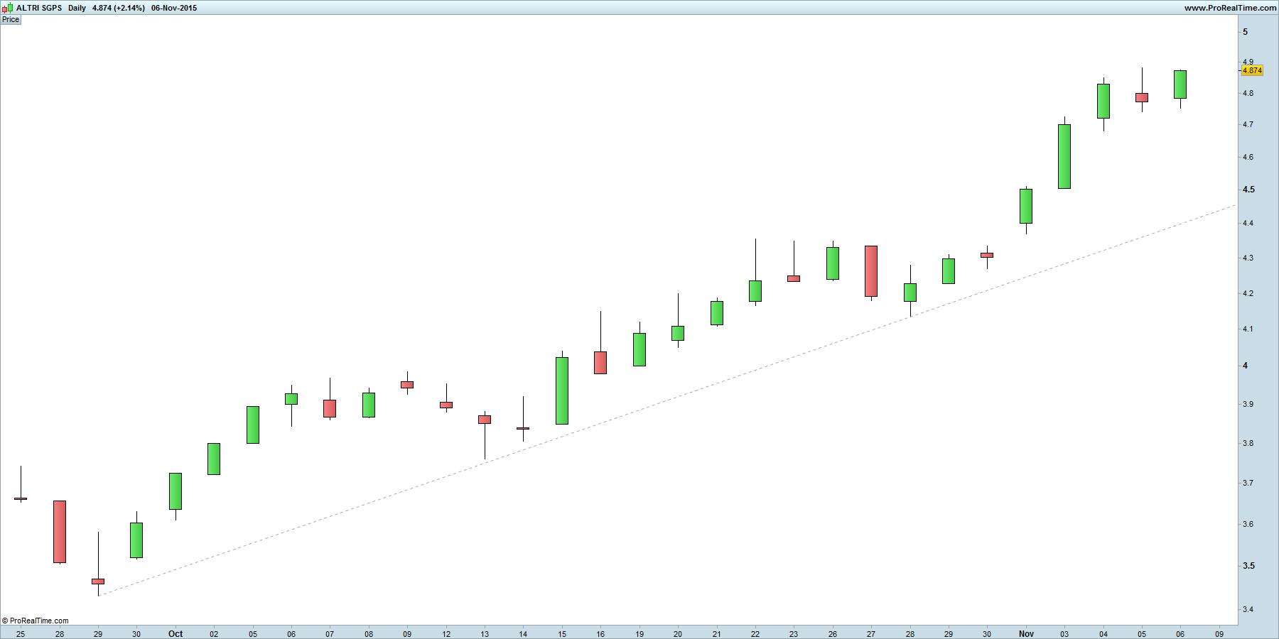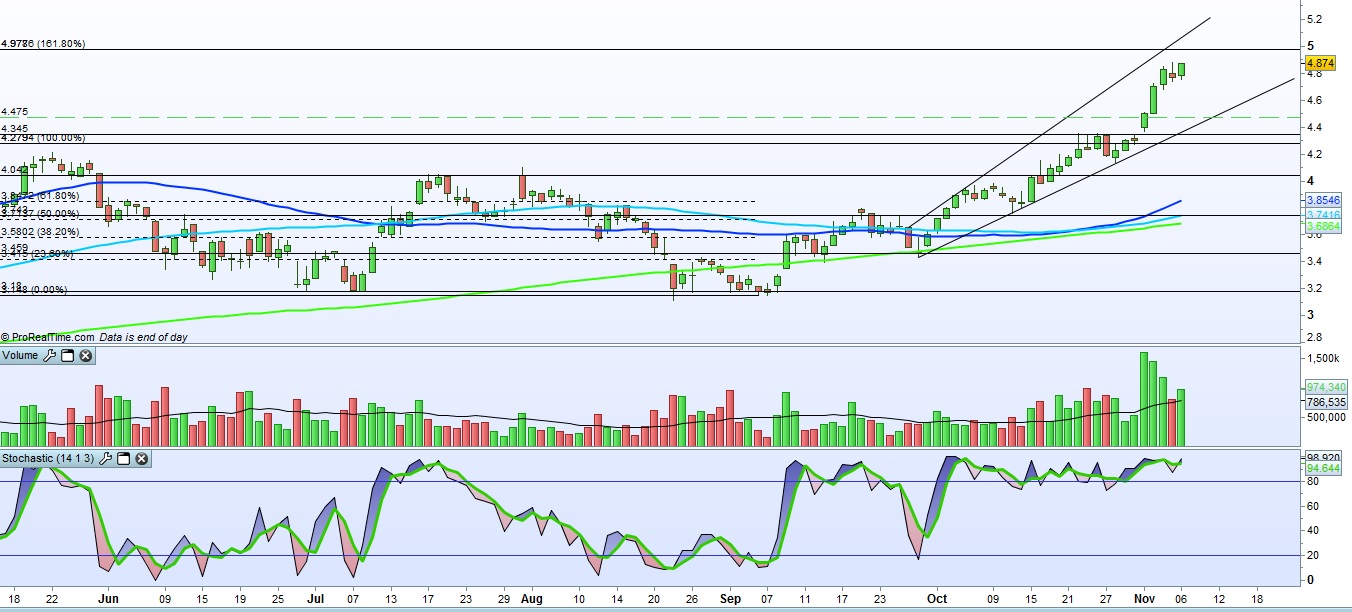Tem vindo a surpreender bastante. Esperava-se que, ao chegar os 4.50, atingisse a zona de resistência e corrigisse um pouco, mas continuou a escalada e começou a perder força a partir dos 4.75. Os resultados do 3T e a politica de dividendos foi o que impulsionou a dar o 'boom' inicial, dos 4.30 até aos 4.80.