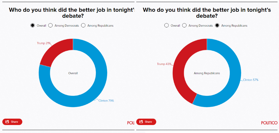 Overall, roughly 80 percent of insiders — with equal numbers of Democrats and Republicans responding to the post-debate survey — said Clinton did the better job at the debate, including 99 percent of Democrats and 57 percent of Republicans. Only 21 percent — 1 percent of Democrats and 43 percent of Republicans — picked Trump as the winner.