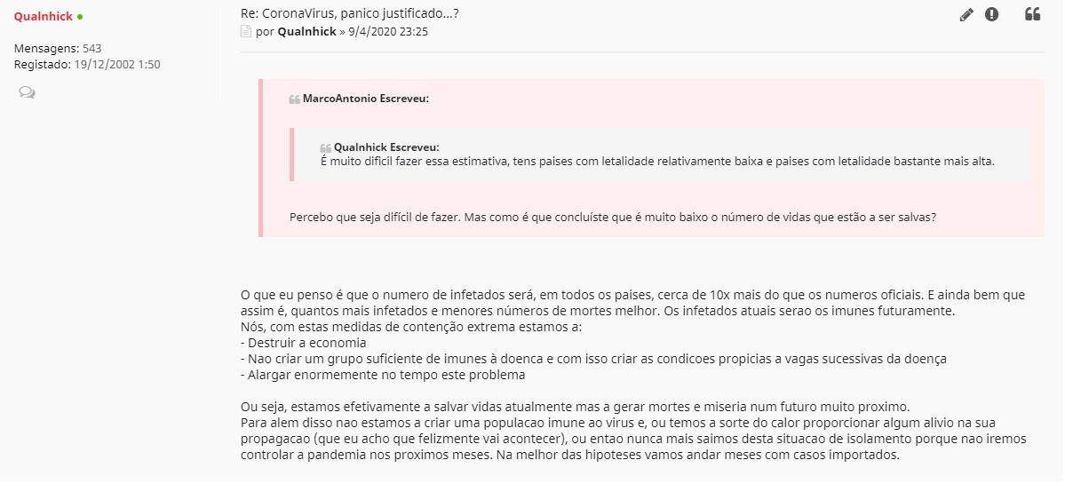 MarcoAntonio Escreveu:Ok, tudo bem, não tinha presente que tinhas escrito isso pela mesma altura. Percebo um pouco melhor a tua resposta, mas, nesse caso, ora utilizavas e advogavas expressamente a utilização dos números oficiais, ora estimavas os números reais e descartavas os oficiais.