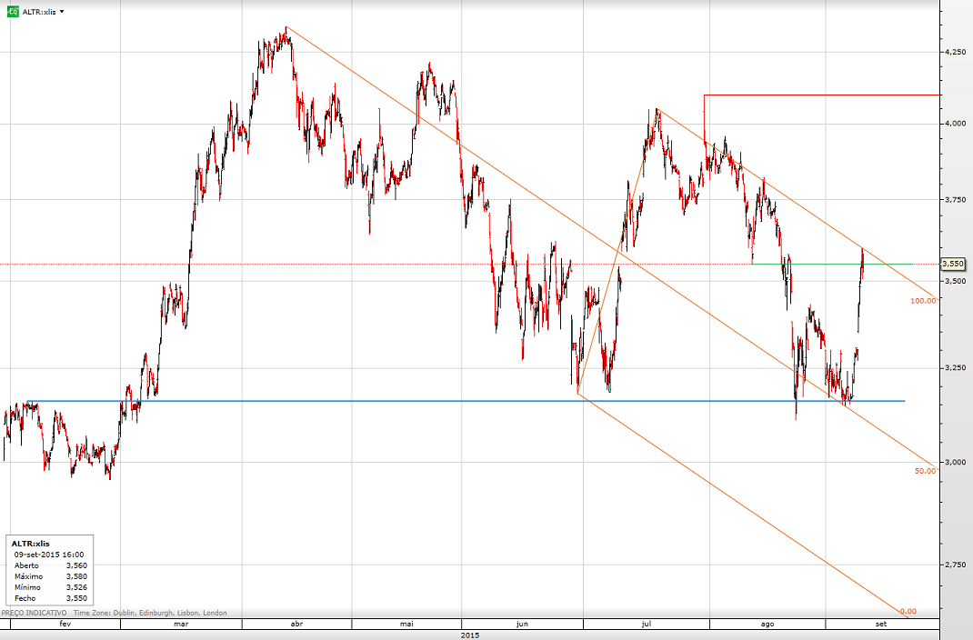 Resolvi entrar curto na altri no final da sessao,stop loss 3,45€,projecao do duplo tecto caso se confirme na casa dos 2 € com a perda da necline,medias moveis com cruzamentos descendentes em grafico 120 min e diario,trix em terreno negativo.Temos ainda um pequeno gap ate aos 3.24€.