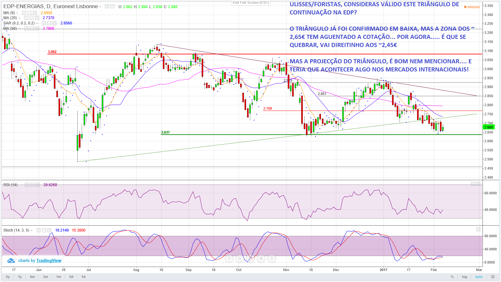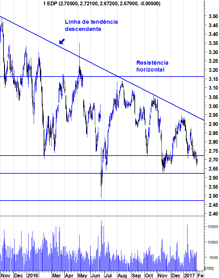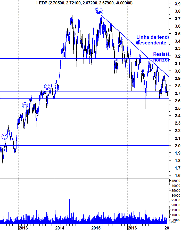 Deixo aqui como eu estava a ver a EDP. O que tinha na mente era procurar por uma oportunidade de reverter a tendência descendente.