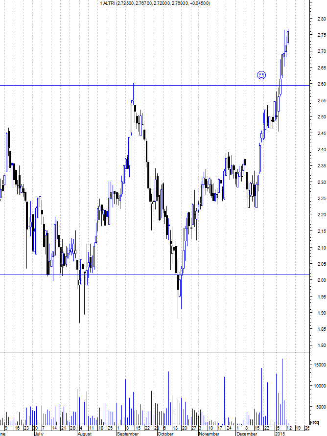A Altri continua imparável, quebrando sem pestanejar a resistência na zona dos 2,6. Dado o ritmo acelerado das subidas, é provável que uma correcção de curto prazo esteja à porta, mas em todos os horizontes temporais a acção está sob domínio dos touros.