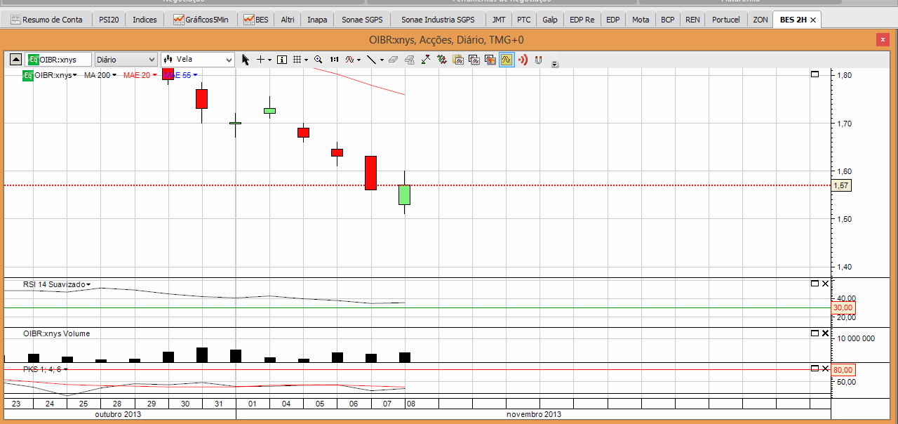 E boas notícias: depois de uma ténue recuperação na 6ª feira passada, hoje a cotação vai bem lançada, com uma valorização de quase 3,50%. E como as cotadas estão (ou estão em vias de) ligadas umbicalmente, estas subidas da OI devem (se o mercado funcionar racionalmente) ter o mesmo efeito na PT.