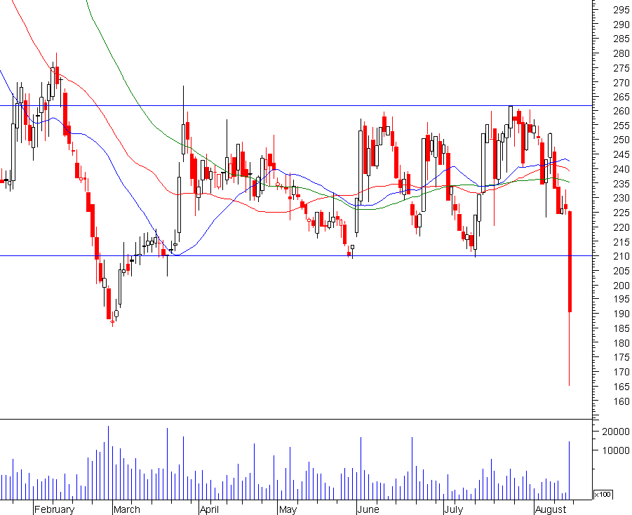 A situação não se alterou muito desde a última actualização, temos uma resistência bem definida nos 260 e um suporte nos 210. Enquanto o título não sair deste intervalo, nada se conclui.