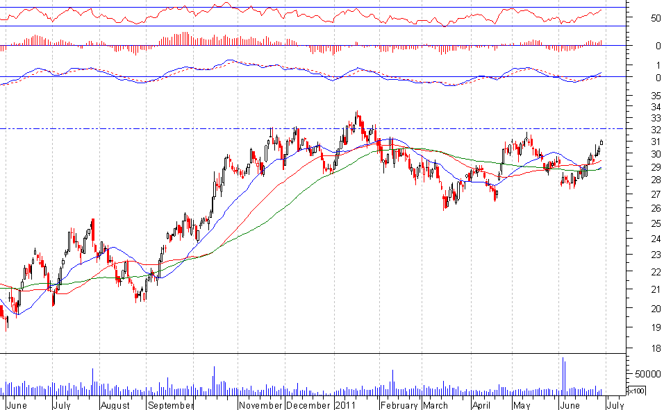 Identifico um suporte na zona dos 28 e uma resistência algures pelos 31,5 - o título tem estado a flutuar dentro deste intervalo e por isso enquanto a cotação se mantiver nestes valores não consigo prever o que vai acontecer à acção. Em caso de ruptura pelo lado superior, espero que o título arranque para novos máximos; se, pelo contrário, os 28 não segurarem a cotação, acredito numa correcção mais ampla, possivelmente até aos 25 (antiga resistência, actual suporte).
