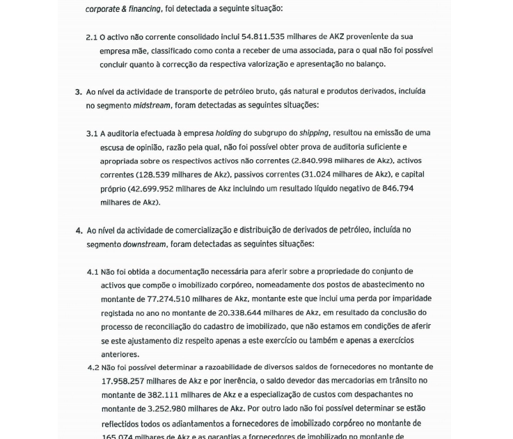 falencia técnica é os cp serem 0 ora 25% dos cp está no relatório do auditor por este excerto pode conluir-se que quase outros 20% vem dos mais de 400000m de ativos de exploração e avaliação que não valem nada mais 20% vem das outras contas a receber do estado angolano mas que nao entraram (vem agora o dinheiro dos chineses )mais 500000m azk de ativos e com isto chegamos a 75%, resta 30% que devem ser ativos de exploração sobre avaliados prejuizo de 2015 com petroleo barato... porque vejamos o proximo post