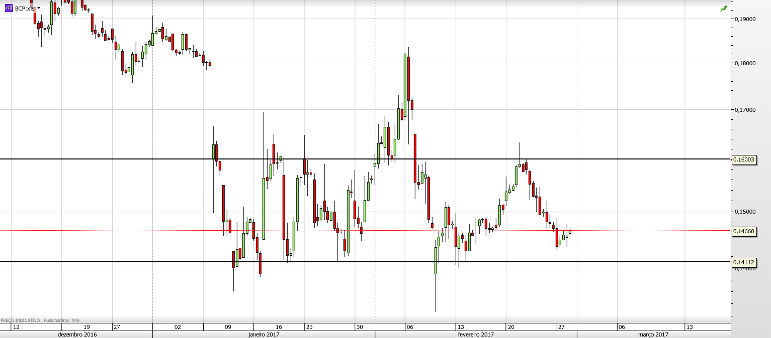 Tanta coisa pode acontecer...: resultados acimas das expectativas; incorporação de grande parte do malparado nos resultados de 2016, libertando os resultados de 2017 desse peso negativo; novidades acerca do futuro do BCP que poderão ser apresentadas na conferência de imprensa no dia 6 e o facto de estarem cada vez mais próximas as soluções governamentais e europeias para resolver de vez o problema das imparidades. O facto de a cotação estar quase em mínimos de sempre apesar da resolução de alguns problemas que afectavam os resultados do BCP e o facto de haver expectativas generalizadas de que o pior na banca já passou e que o futuro vai ser bem melhor.