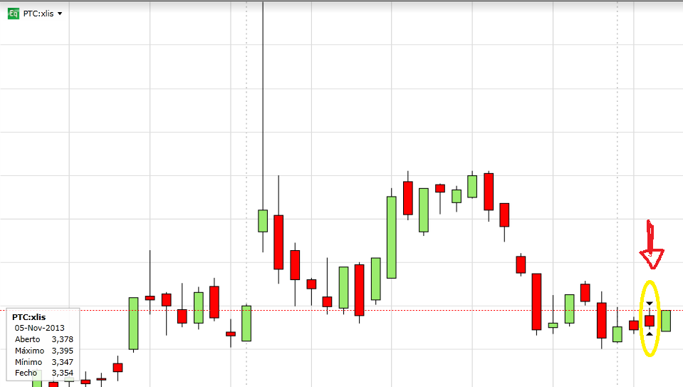 No gráfico abaixo, a vela selecionada não deveria estar a verde, porque o fecho da sessão foi com valor superior ao do dia anterior?