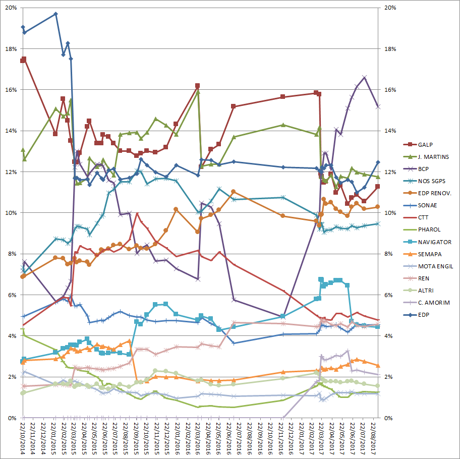 Como são estas empresas que detêm a maior parte do peso e para mim estão todas em topos e com valores muito elevados em relação aos fundamentais e sem grandes expectativas de crescimento futuro dos resultados , sendo os exemplos mais evidente para mim JMT, EDP , GALP com PERS elevados ou sem perspetivas de crescimento como se tem visto nos resultados da EDP, não existe incentivo para comprar nestes preços .