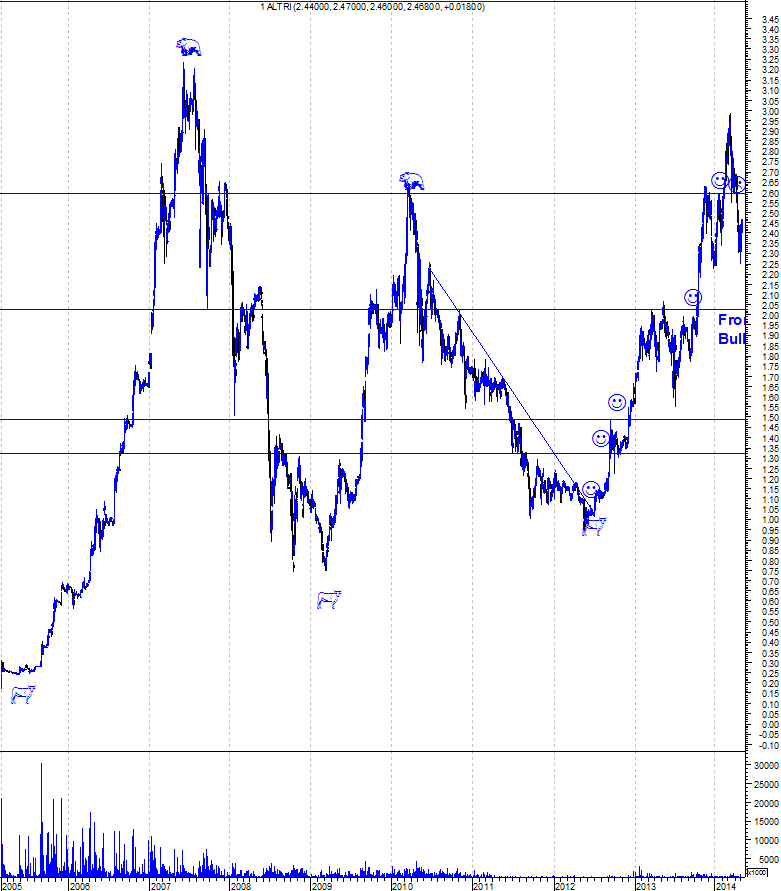 Não tenho muito a dizer, Vodka. Em termos de longo prazo, a tendência continua ascendente e o "Bull Market" só poderá estar em causa em caso de quebra da zona de suporte entre os 2 e os 2,05. Em termos de curto e médio prazo, a tendência é descendente e é importante que os touros voltem ao comando da acção, quebrando a resistência da zona dos 2,6 euros. Por isso, com tendências diferentes nos diferentes horizontes temporais, não há grandes conclusões a tirar.