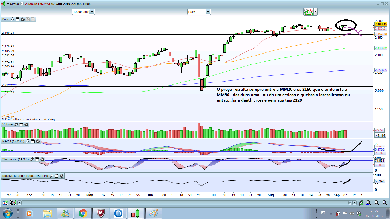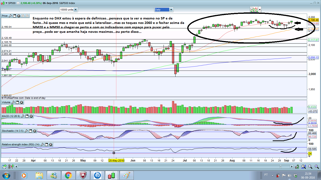 Este bicho, sp500, tem estado como um relógio suíço. Aos que deixaram correr a posição longo de ontem, ao contrário de mim por várias razões, estão de parabéns, pois correu bem. Tirando essa oportunidade, hoje deu uma: curto com entrada/venda nos 2178 e alvo fecho do gap/ 2171,55... mas como eram poucos pontos não avancei e hoje estou em branco