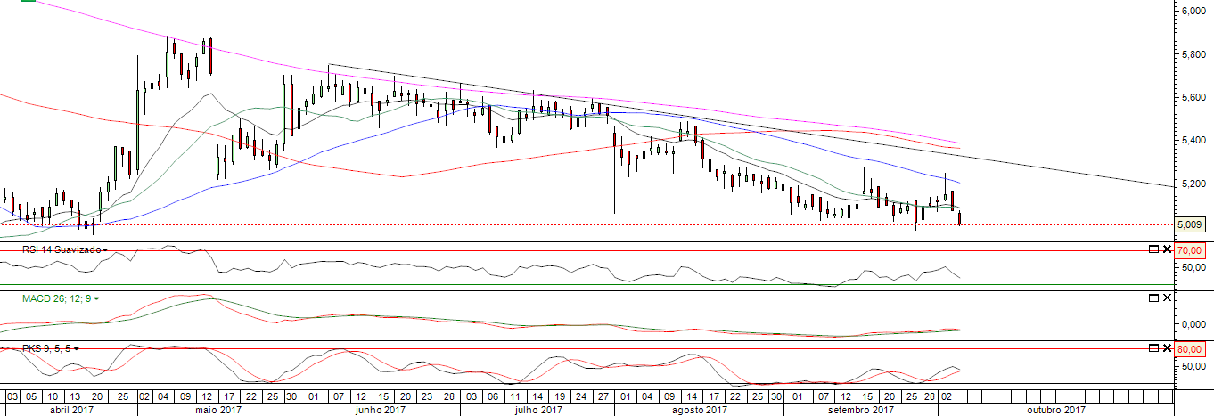 Hoje o patinho feio parece querer dar um ar da sua graça, mas parou exactamente antes de fazer um higher high (não ultrapassando 18 de Setembro, 5,275), algo que já não faz desde Maio...