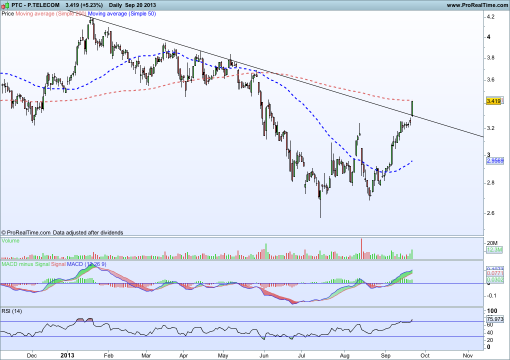 A mim, tendo por base este gráfico, parece-me que desde que se mantenha acima desta LTD estará com mais probabilidade de subir do que descer. Até onde irá chegar nãp sei, mas talvez a tal resistência por volta dos 3,70€ possam dar luta. O que me parece é que no curto/médio prazo a quebra da LTD foi em alta e neste espaço de tempo o destino será norte. Atenção que não tenho qualquer titulo da PT, mas neste momento é assim que interpreto a cotada. Também não me iria fazer confusão que nos próximos dias possa andar a lateralizar ou descendo ligeiramente do fecho de 19/09, afim de corrigir ou ajustar qualquer coisinha! Vamos ver...