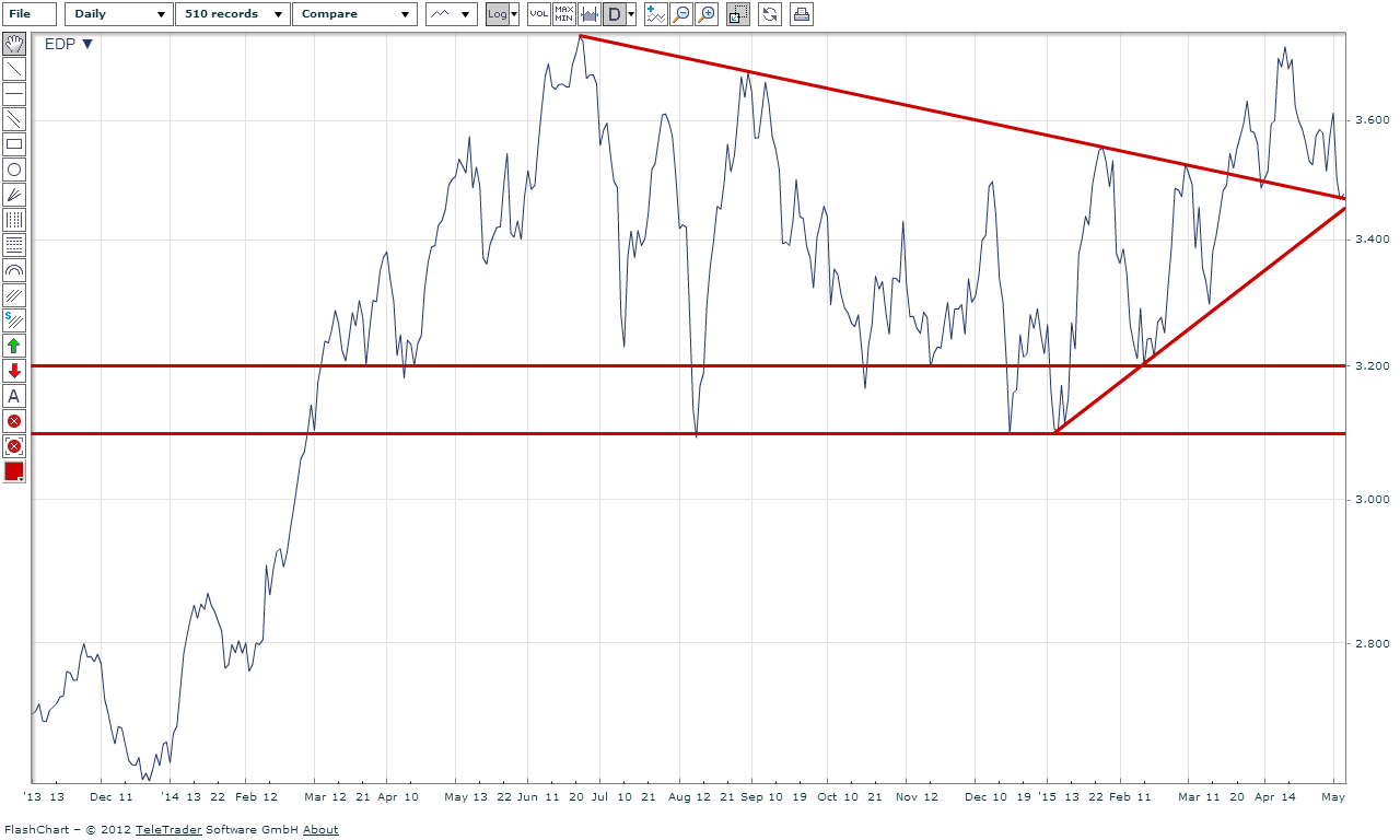 A EDP lateraliza há mais de um ano entre os 3.10 e os 3.75.