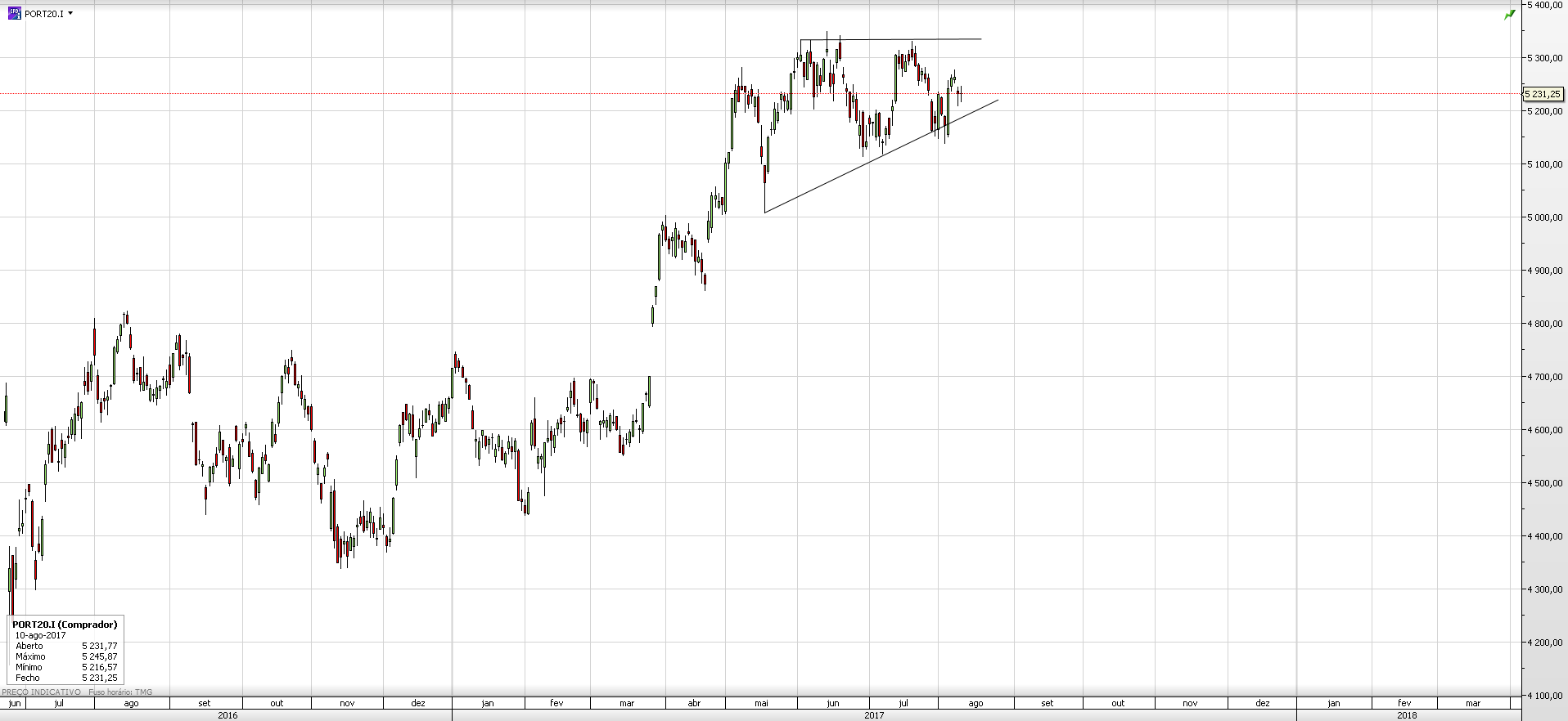 O PSI está desde o dia 28 de Julho entalado entre os 5150 e os 5250, com 6 velas a variar entre estes extremos , tendo hoje a vela tocado nos 2 extremos .