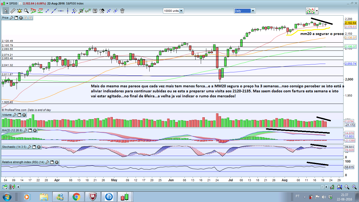 Dois Dojis seguidos no semanal...indicadores em sobre compra...mas o preço nao desce...anda ali a variar 25 pontos la em cima...Nao passa nada...mas o que é engracado é que é mais verossimil uma ida aos 2200 do que uma ida aos 2130