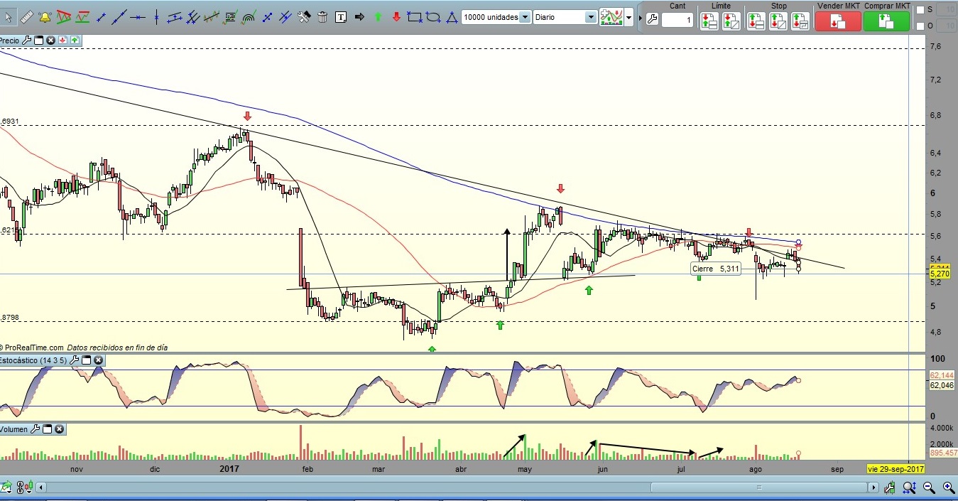 No diário há ali uma terra de ninguém entre os 5,16 e os 5,25. Possível que o preço suba até à LTD, se assim o fizer e e furar esta a resistência parece estar nos 5,68 EUR (mais coisa menos coisa).