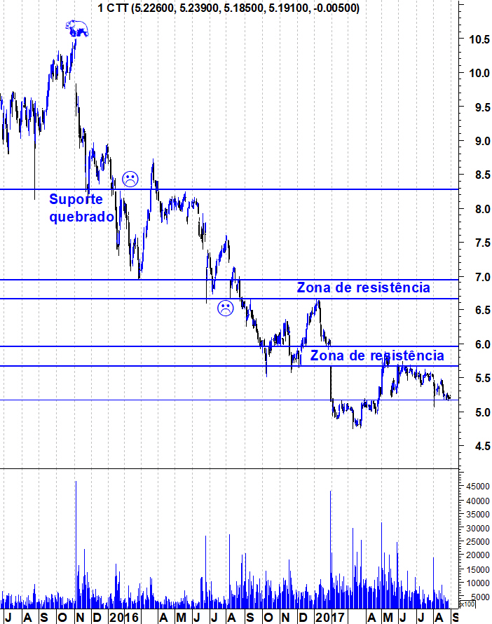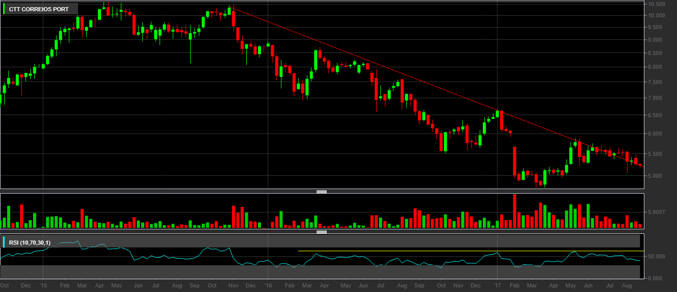 P.Mendes, da mesma forma que em "Bull Market" digo que o que é relevante são os suportes pois a sua quebra pode indiciar que algo mudou, em "Bear Markets" aquilo que é importante é perceber onde estão as resistências, os suportes são irrelevantes pois a tendência é descendente e infelizmente, os CTT continuam num claro "Bear Market" desde há mais de um ano e meio.