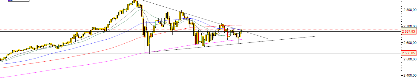 NO Sp500 na minha perspetiva ainda não saiu do triangulo em alta , nem ultrapassou ainda a MM50 nem a zona 2700.