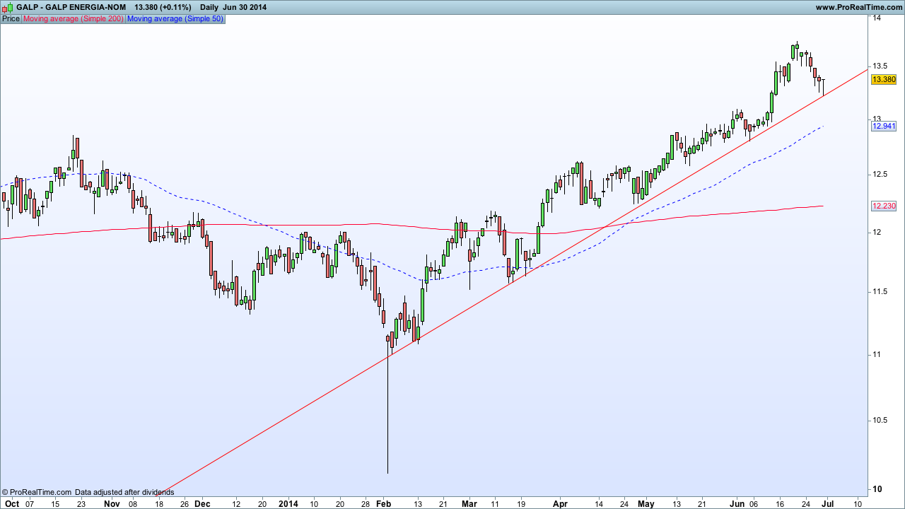 The molle, essa linha tem um declive totalmente insustentável, vai ser quebrada em breve (se é que ja não foi). A galp fez um higher high, e apos tanto tempo a subir vai corrigir para provavelmente fazer um higher low, altura que criará um bom ponto de entrada.