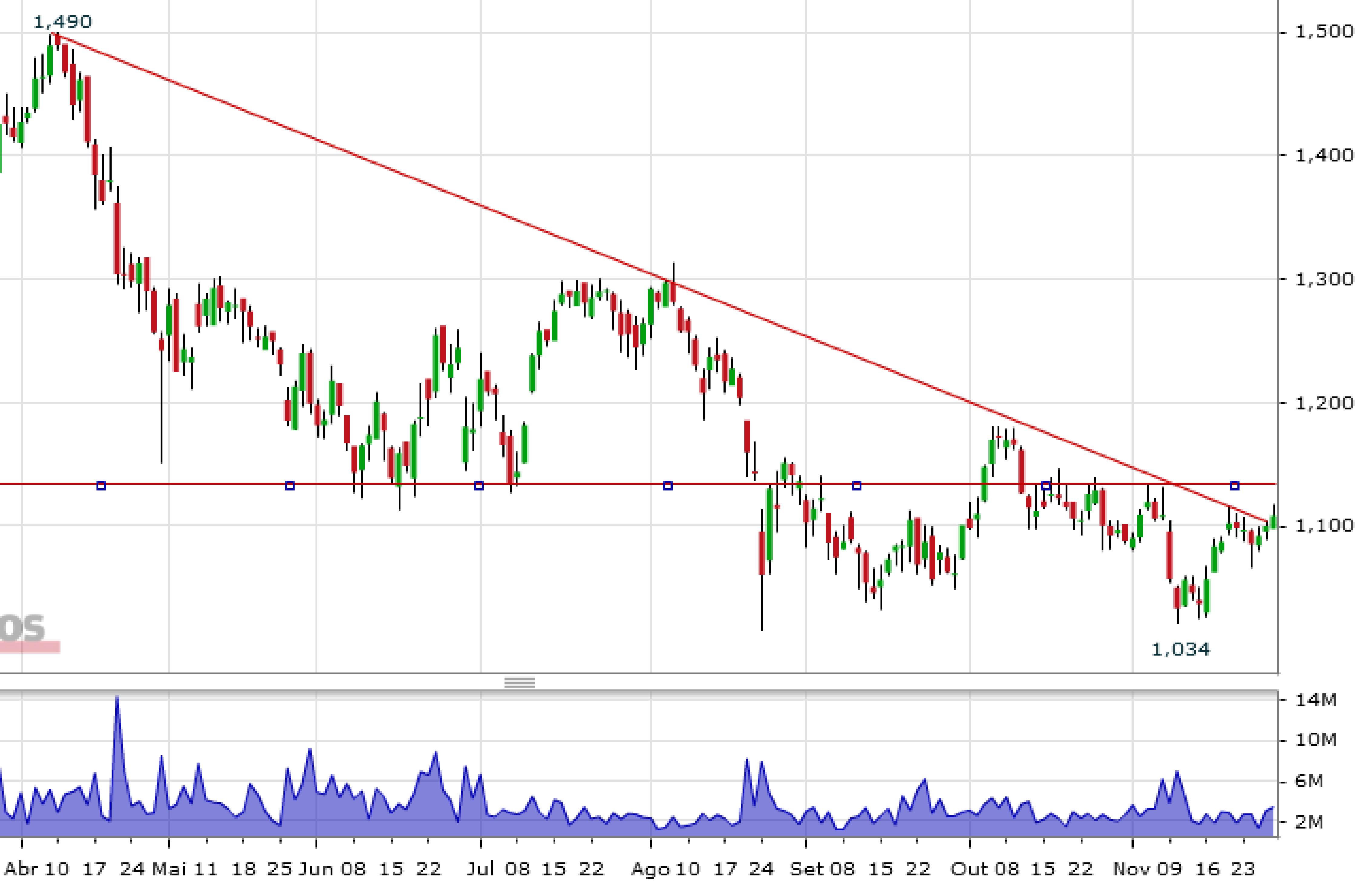 Gostei do comentário do iMMgrafik. Verifiquei que hoje é provável que a SONAE tenha iniciado a quebra da linha de tendência negativa que tem desde abril. No entanto, não me parece claro que seja assim. Julgo que haverá uma pequena resistência por volta de 1€14 e, por isso, o valor de 1€17 mostrará uma tendência mais clara e deverá ser um valor mais seguro para entrar.