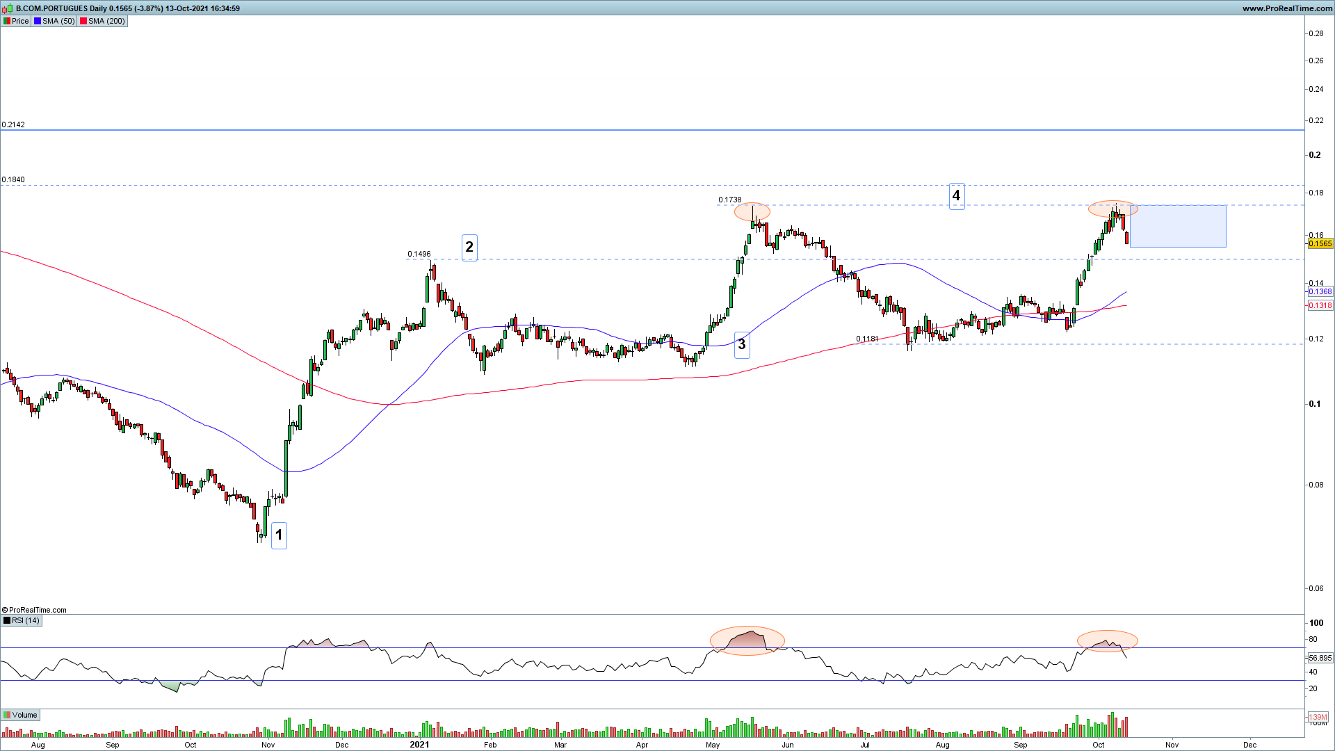 Quando o BCP atingiu os .19 (anterior máximo relativo) estava overbought. É garantido que vai parar ali? Não. Mas nesse momento temos de saber que a probabilidade de recuar ou consolidar abaixo é muito alta. O risco aumentou exponencial e devemos proteger os nossos ganhos.