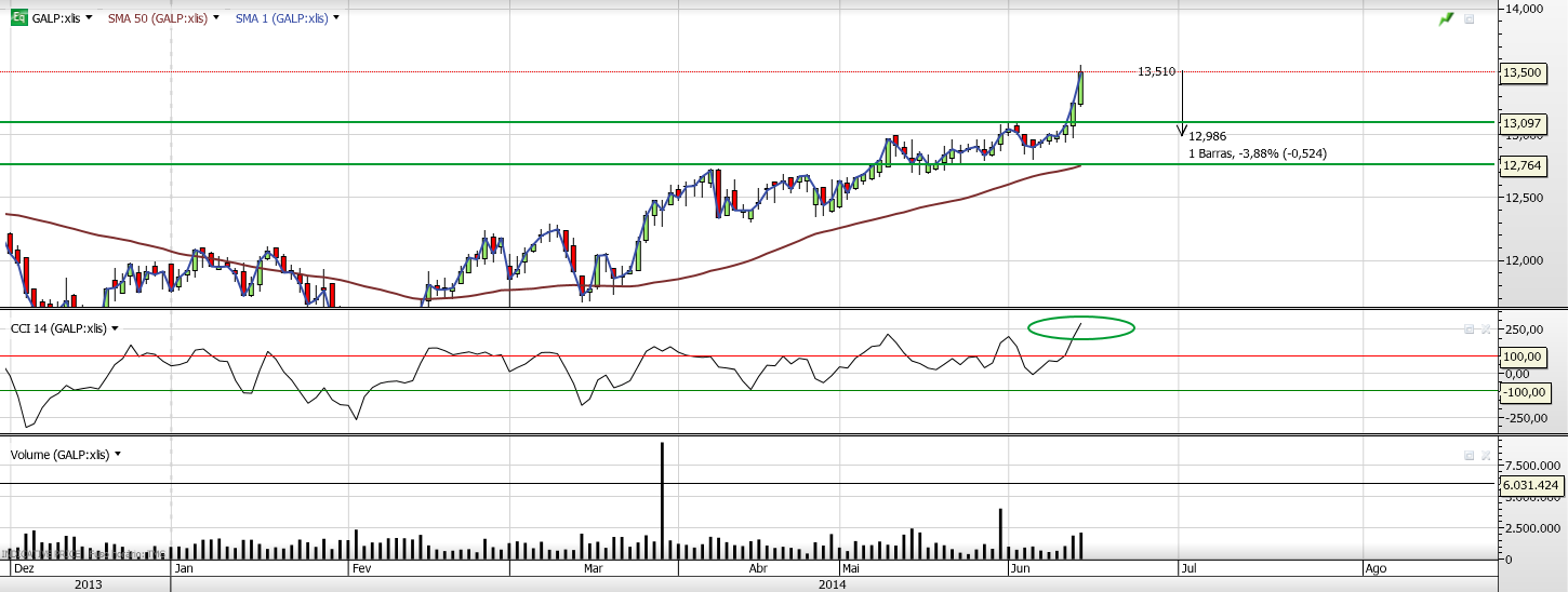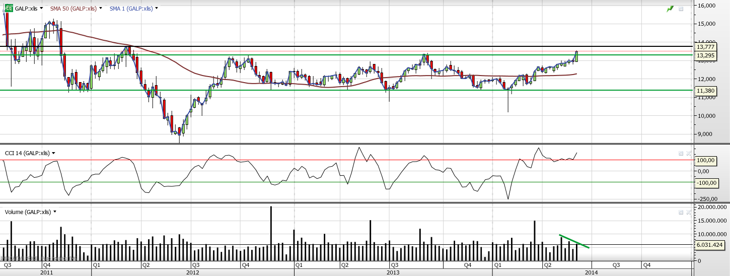 Fui rever o Discos Pedidos de 27 de Maio sobre a GALP e o Ulisses foi muito claro quanto à quebra da resistência dos 13,40. No entanto como sabem o Tiago Esteves fez no dia 12 de Junho uma análise à cotada onde colocou a possibilidade de uma queda da cotada para breve (http://surfaratendencia.blogspot.pt/201 ... anais.html). No dia seguinte em função da quebra dos 13,40 pedi um follow up ao Tiago e referiu-me que ainda existe uma resistência antiga a ter em conta, no caso a dos 13,77. Os 13,40 seriam um novo higher-higher, e a cotada tende agora para a resistência, acreditando o Tiago que se vá ficar pelo caminho pois não aguentará a escalada. Não creio que as análises sejam contraditórias pois o ataque à nova resistência pode perfeitamente ser rechaçada para posteriormente, após uma queda, existir novo “ataque”.