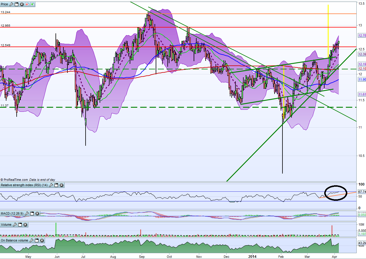 O seu gráfico de CP está bullish mas aquela resistência na zona dos 13€ deverá ser um osso duro de roer para continuar o caminho para norte, além de lhe faltar algum volume nesta subida.