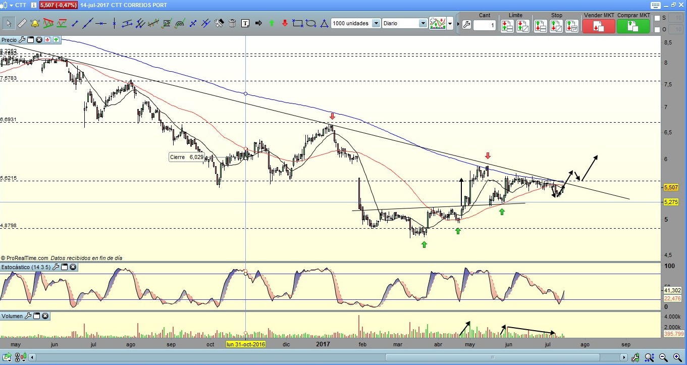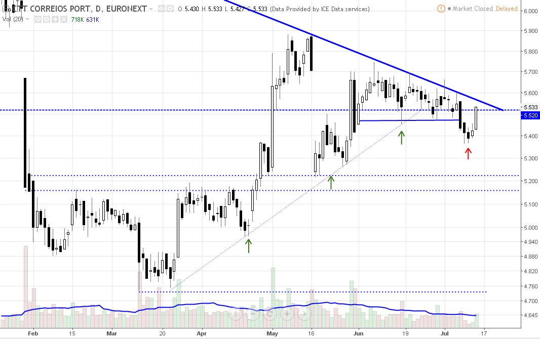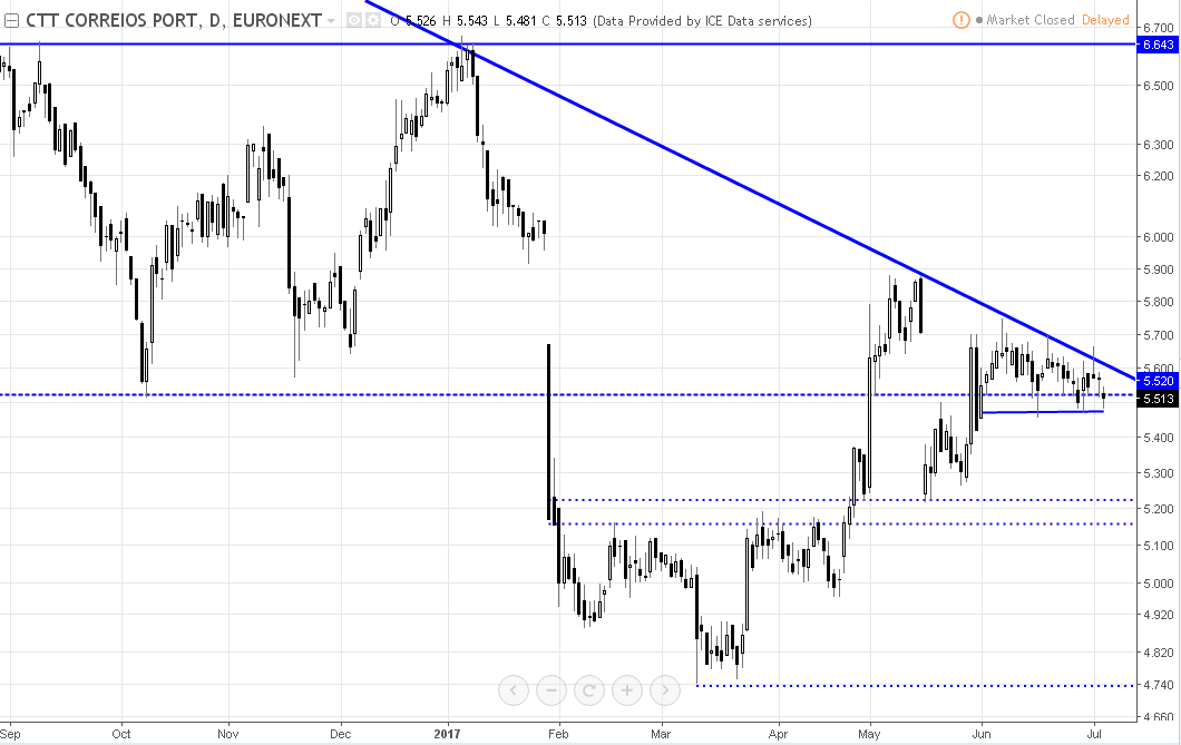Os CTT poisaram num 1.º suporte em 5,39. Se partir é mais uma vitória para ursos e a cotação poderá aproximar-se de 5.