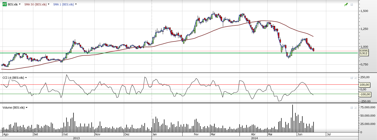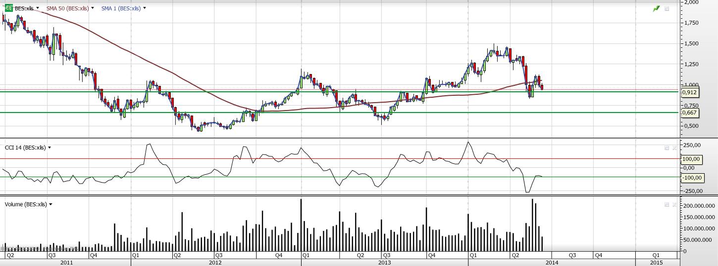 A minha leitura do gráfico do BES diz-me que está numa zona de suporte muito importante, ou reage aqui e sobe ou quebra esta zona e pode ir aos 0.66/0.67; os próximos dias vão mostrar como vai ser.