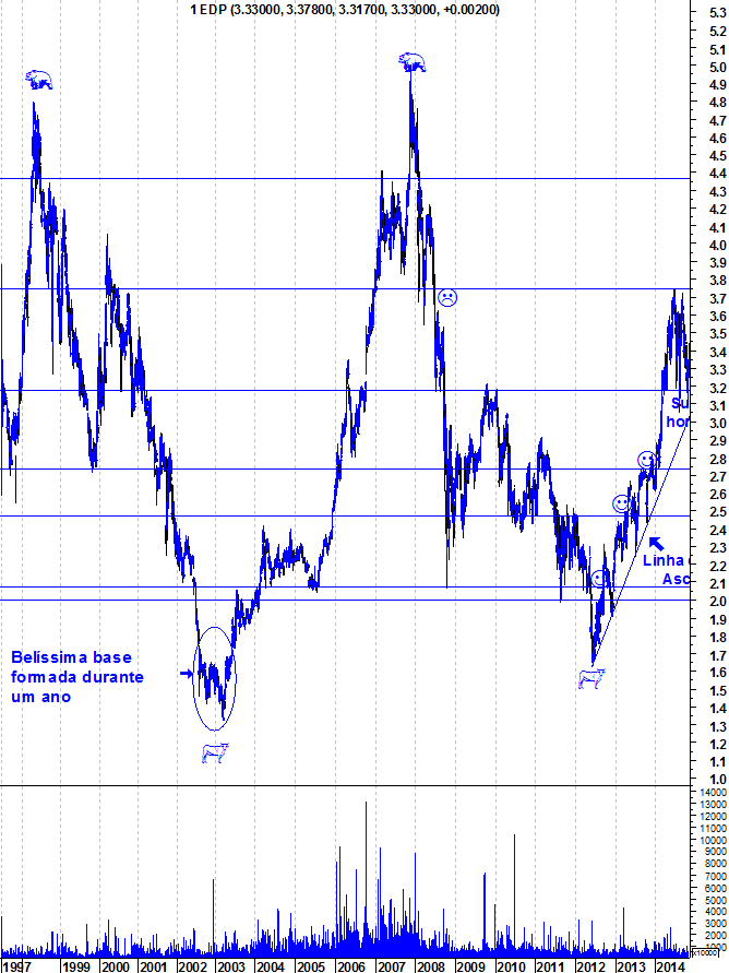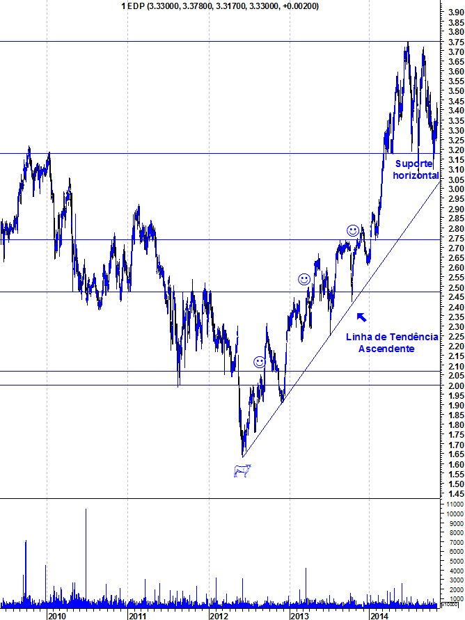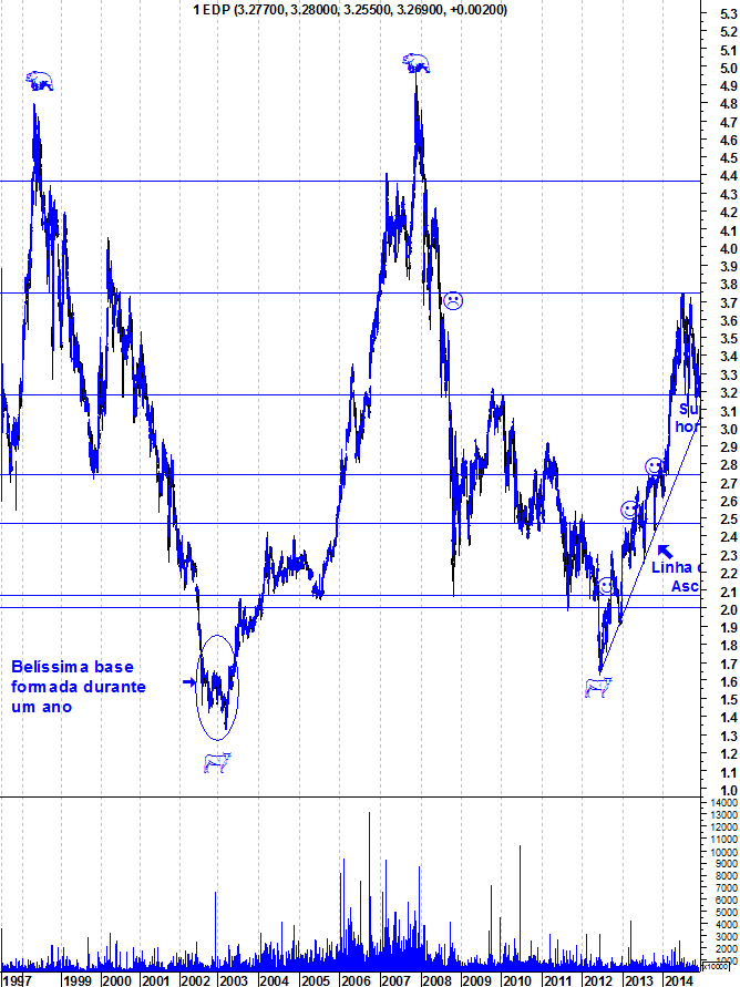 A EDP apresenta fortíssima probabilidade técnica de vir a quebrar em baixa o seu suporte que marca a tendência. Diria que está à porta do seu bear market (extenso ou curto? Ver-se-á mais adiante...) e que nele vai entrar. Apontaria agora valores, para médio prazo, situados no intervalo entre os 2,90 e os 2,70.