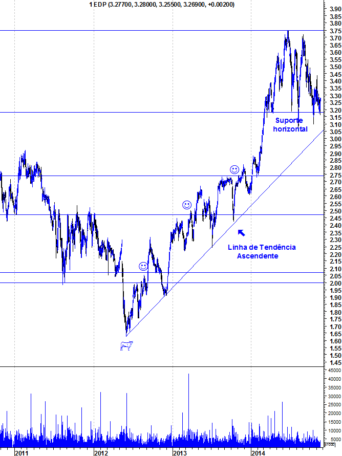 Deixo aqui os gráficos actualizados da EDP que se mantém sem grande entusiasmo mas lá vai sendo suportada pelo suporte horizontal e pela linha de tendência ascendente.
