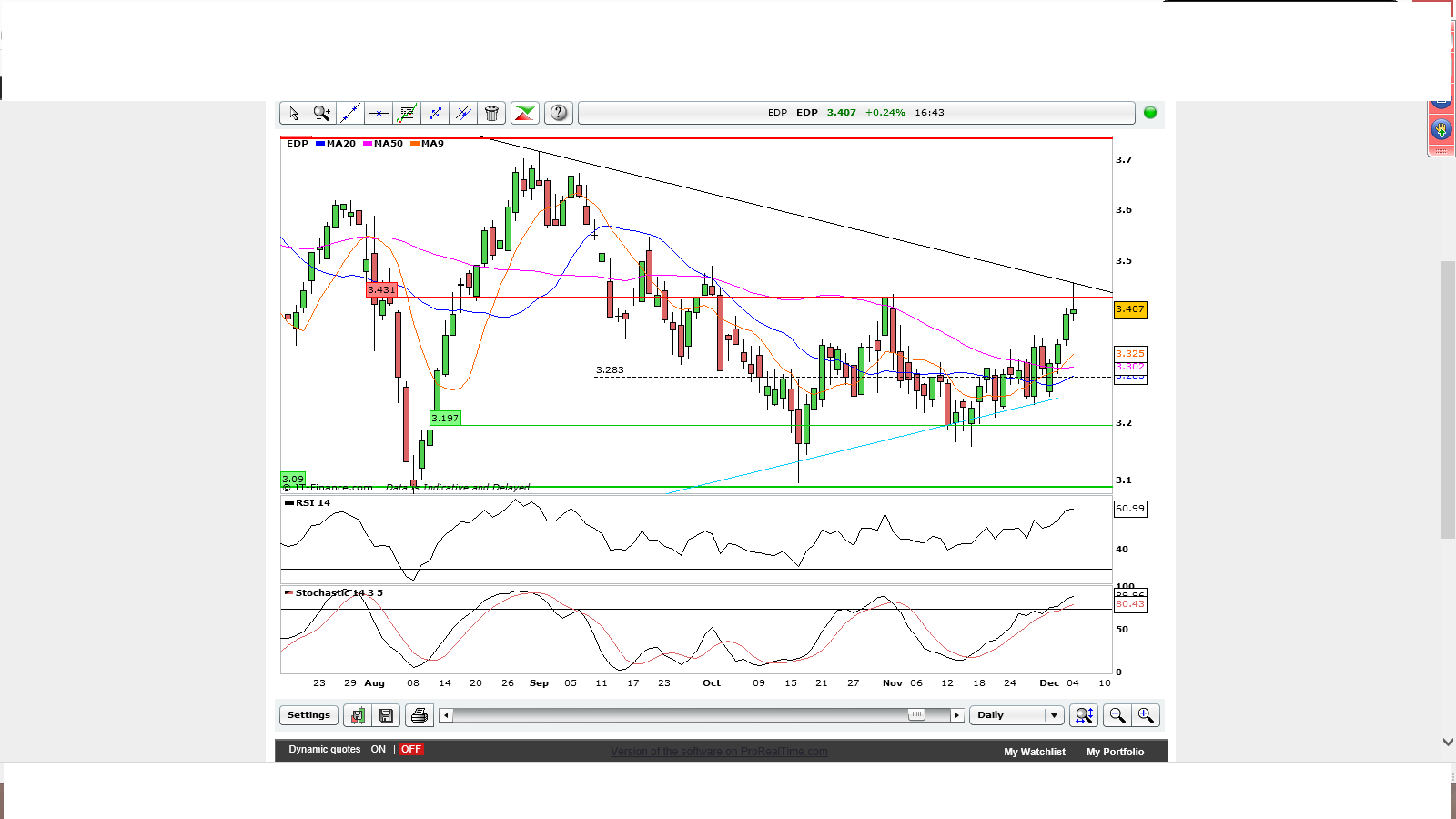 Assim, o que por enquanto espero delas é ver como reagem às suas resistências. Fico a ponderar, no entanto, uma possível lateralização a médio prazo que poderá, no caso da GALP, ocorrer com oscilações entre os 12,43 e os 13,73, e no caso da EDP, entre os 3,09 e os 3,73, sensivelmente. Depois deste período, se a previsão se confirmar, ver-se-á que sinais apresentam as duas empresas.