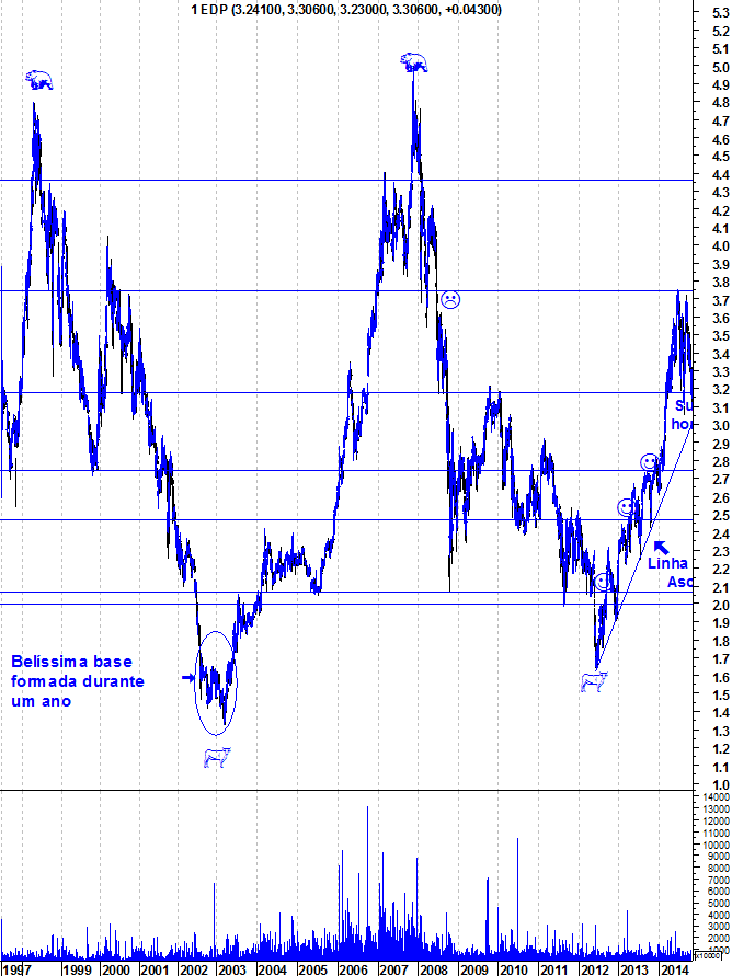 Apesar de tudo, a EDP é das acções que menos sofreu com o mau momento da Bolsa portuguesa e vale hoje mais do dobro do que valia em Julho de 2012, momento em que iniciou o seu “Bull Market”. Longe das grandes notícias, longe dos escândalos, longe das discussões dos investidores, a acção vai continuando o seu percurso e, depois destas correcções, encontra-se agora num importante local técnico.