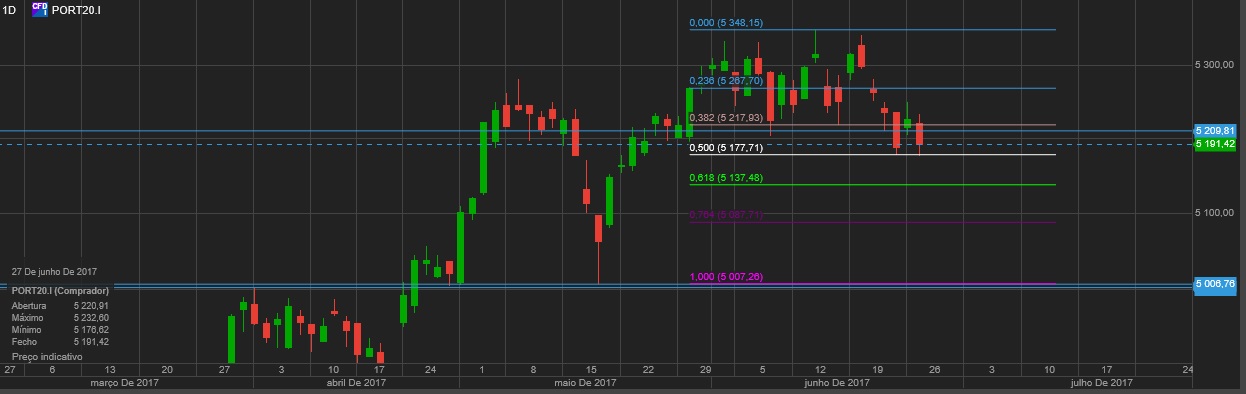 Após visita aos 5330, leva neste momento 6 velas vermelhas com a de hoje . Penso que após fecho de semestre poderá ir visitar o quase inevitável no curto prazo intervalo 4900-5000.