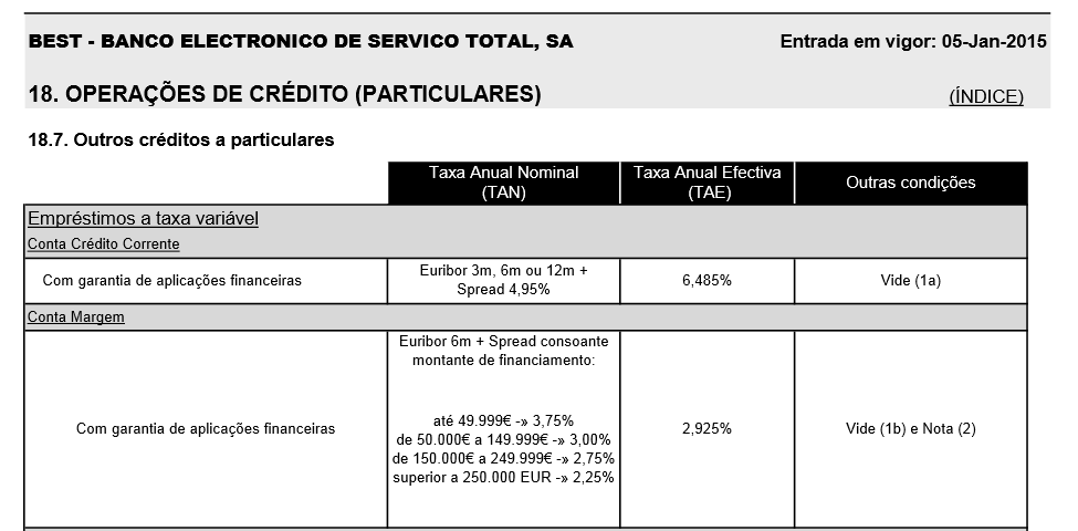 Estou a ver muito entusiasmo com a conta margem do Best para a alavancagem, dadas as taxas de juro baixas, as quais são em função do montante do empréstimo, mas se calhar estão a menosprezar a frase "... sem inclusão de impostos" que aparece na Nota de rodapé por baixo da tabela de taxas.